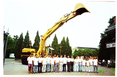 1992年,柳工第一臺自主研發的履帶式挖掘機——WY40正式下線,圖為公司領導及研制小組成員在設備前合影